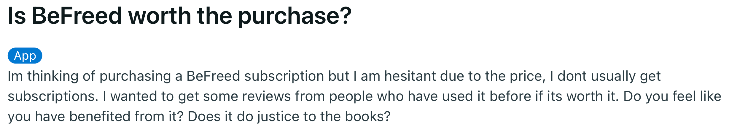 This is evident by looking at how people talk about the product online. Someone described BeFreed as "an app that's perfect for anyone who loves reading non-fiction books but who doesn't have the time to commit to a reading goal every month.”